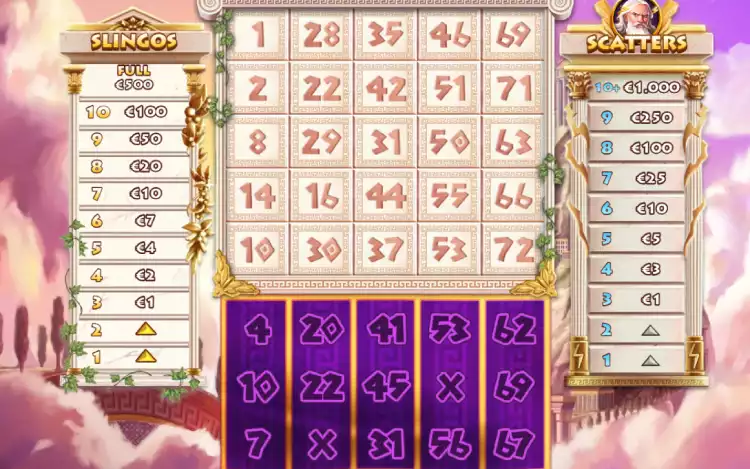 El objetivo en Slingo Thunder of the Gods es completar Slingos, es decir, líneas horizontales, verticales o diagonales de números marcados en el tablero de juego. Cada vez que completas una, asciendes en la escalera de premios, lo que puede aumentar los beneficios futuros.